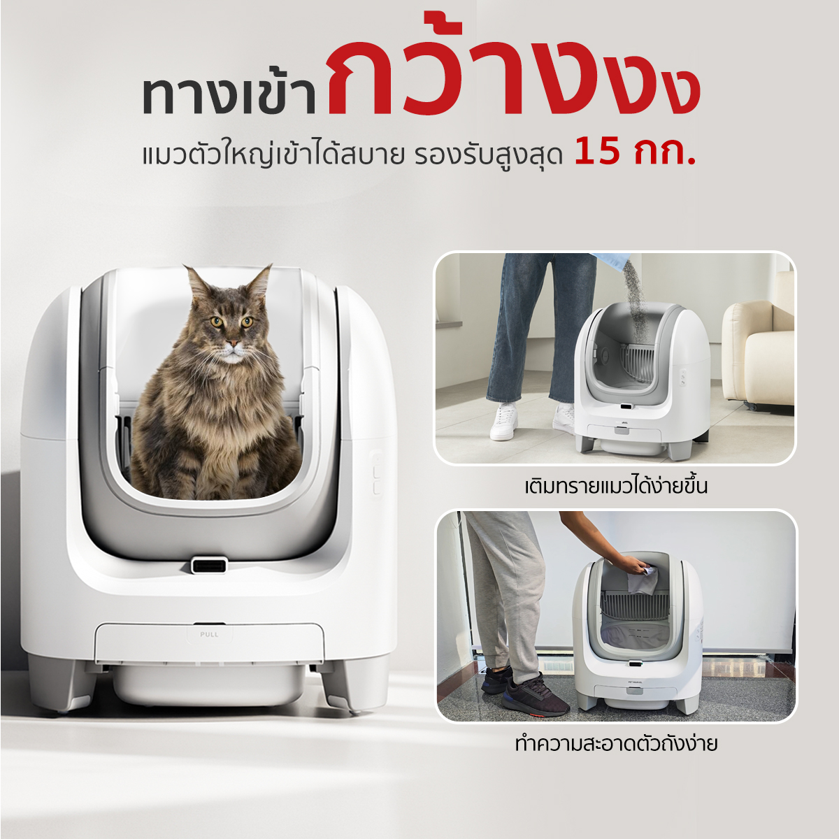 🚩 ทางเข้ากว้าง: แมวตัวใหญ่เข้าใช้งานง่าย (รองรับถึง 15 กก.), เติมทรายและทำความสะอาดตัวถังสะดวก