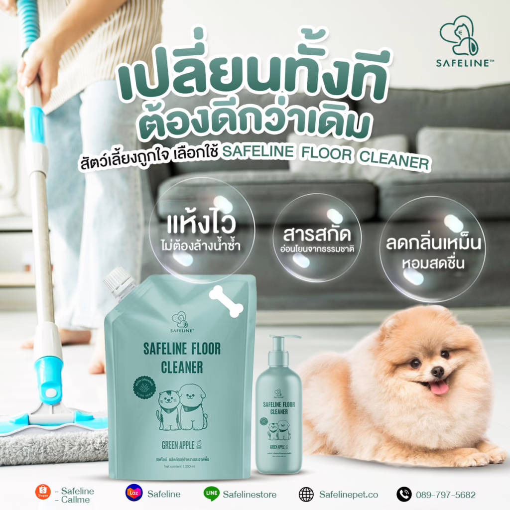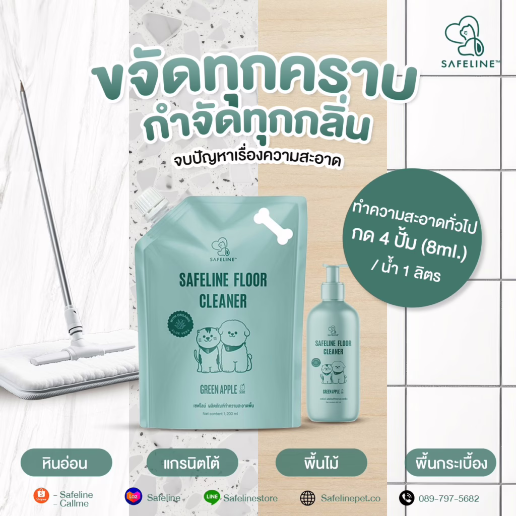 Safeline™ Floor Cleaner Organic : ผลิตภัณฑ์ทำความสะอาดพื้นมีประสิทธิภาพในการทำความสะอาดพื้นผิว สามารถใช้ทำความสะอาดพื้นหลากหลายประเภท เช่น ไม้ หินอ่อน กระเบื้องลามิเนต หรือ กระเบื้องยาง พื้นสะอาดโดยไม่ทิ้งสารเคมีตกค้าง หรือทิ้งคราบเหนียวบนพื้น ปราศจากสารเคมีอันตราย พร้อมกลิ่น Green Apple Food Grade ไม่ทำลายเยื่อบุโพรงจมูกของสัตว์เลี้ยง